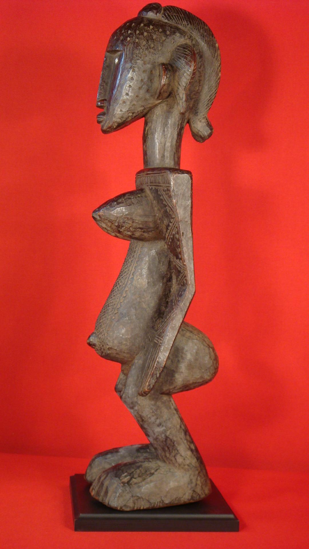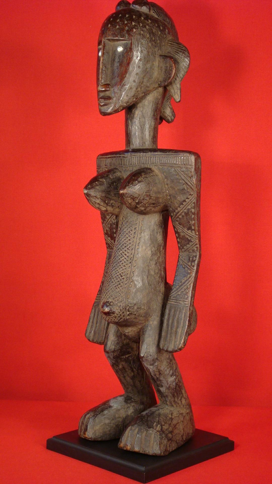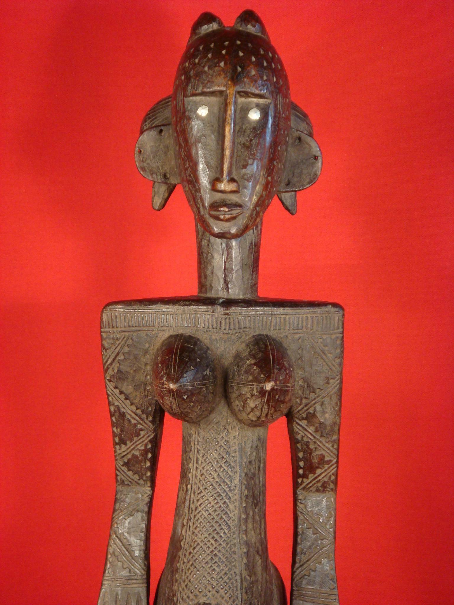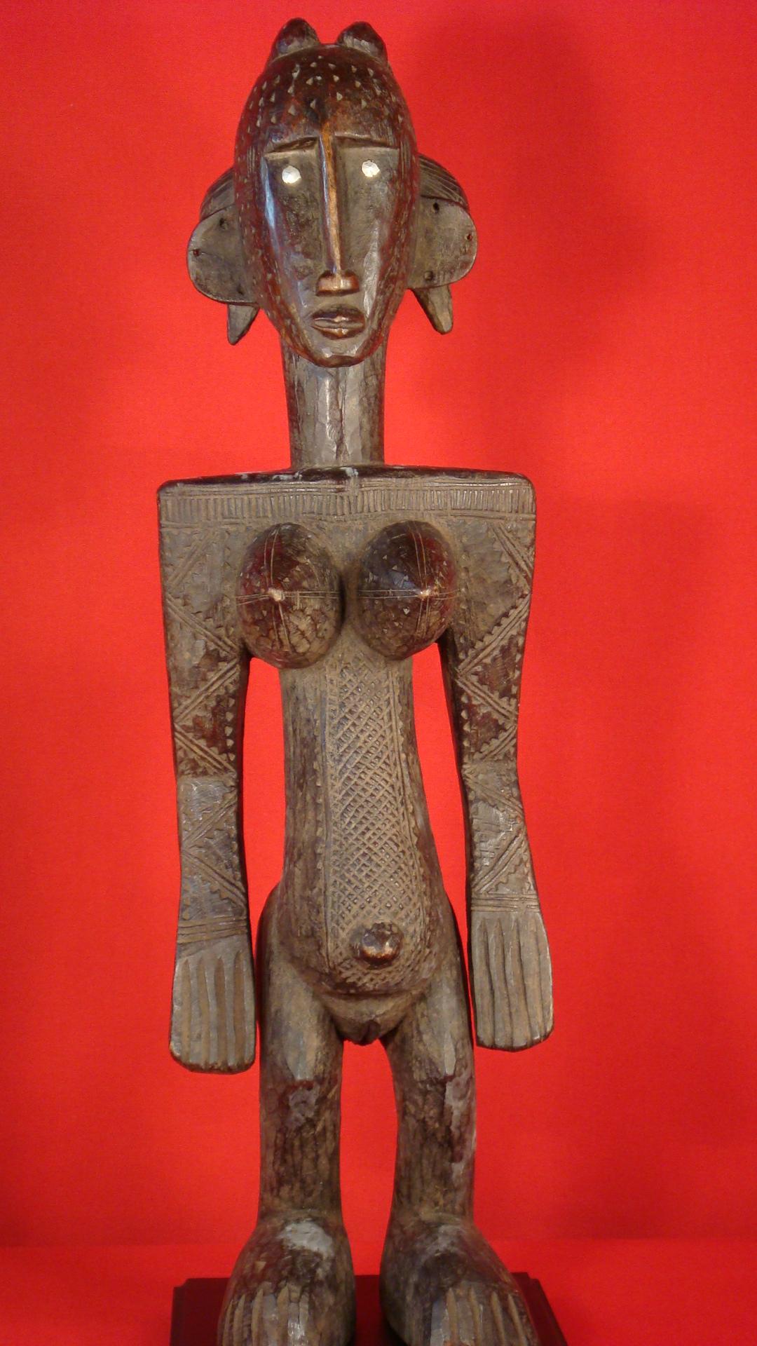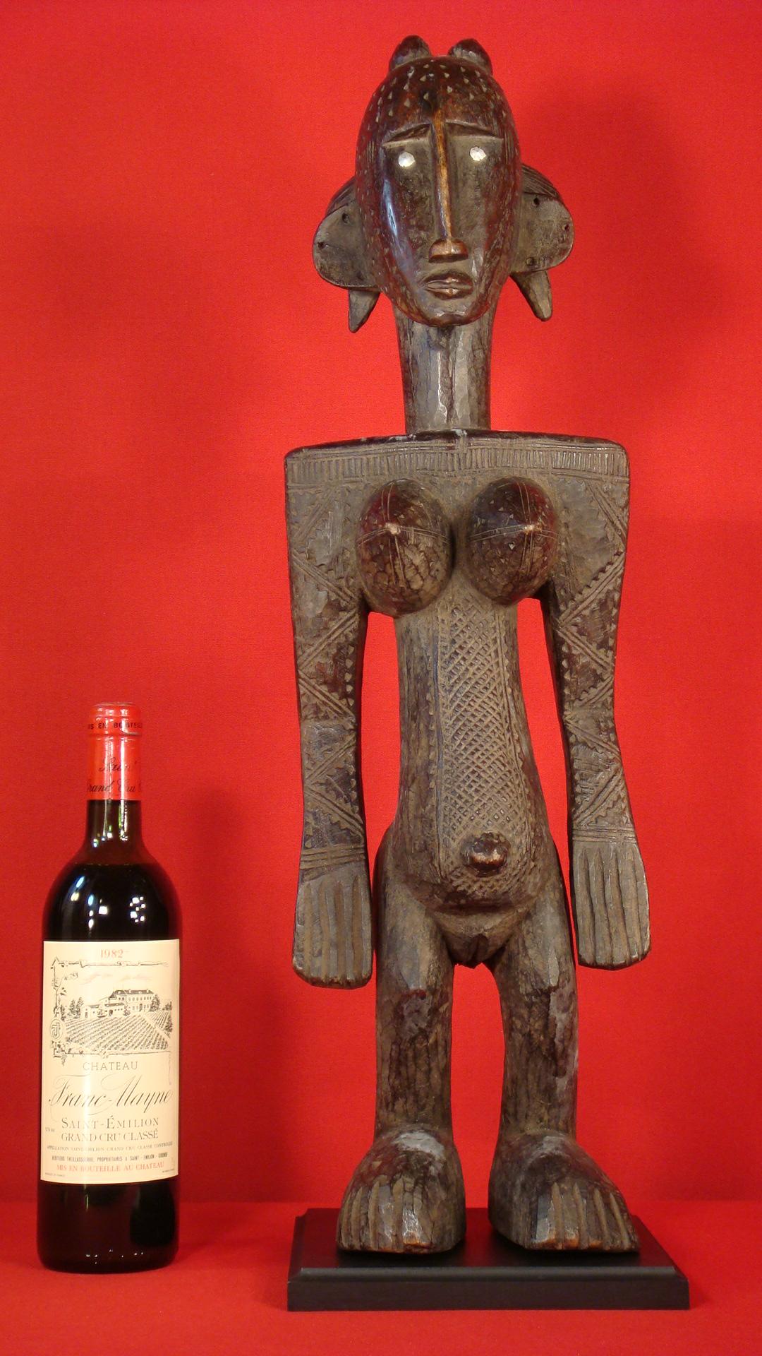 Grande statue Bambara du Mali - XIXème Titre de l'objet : Grande statue Bambara du Mali - XIXème Description : Grande statue de l'ethnie Bambara du Mali - datant de la fin XIXème - pièce importante pour collectionneur - hauteur : 64 cm - belle coiffe, seins proéminents - bois assez bon état, un peu fossilisé, avec des imperfections et fentes dues à l'âge - poids : 4,5 Kg - livrée avec son socle bois - Durant la période pré-électorale, investissez dans des produits culturels issus des collections du Musée d'Art primitifs de Cannes. Matière : 2.600 - Réf annonce n° 346 Voir toutes les photos jusqu'en bas de la page